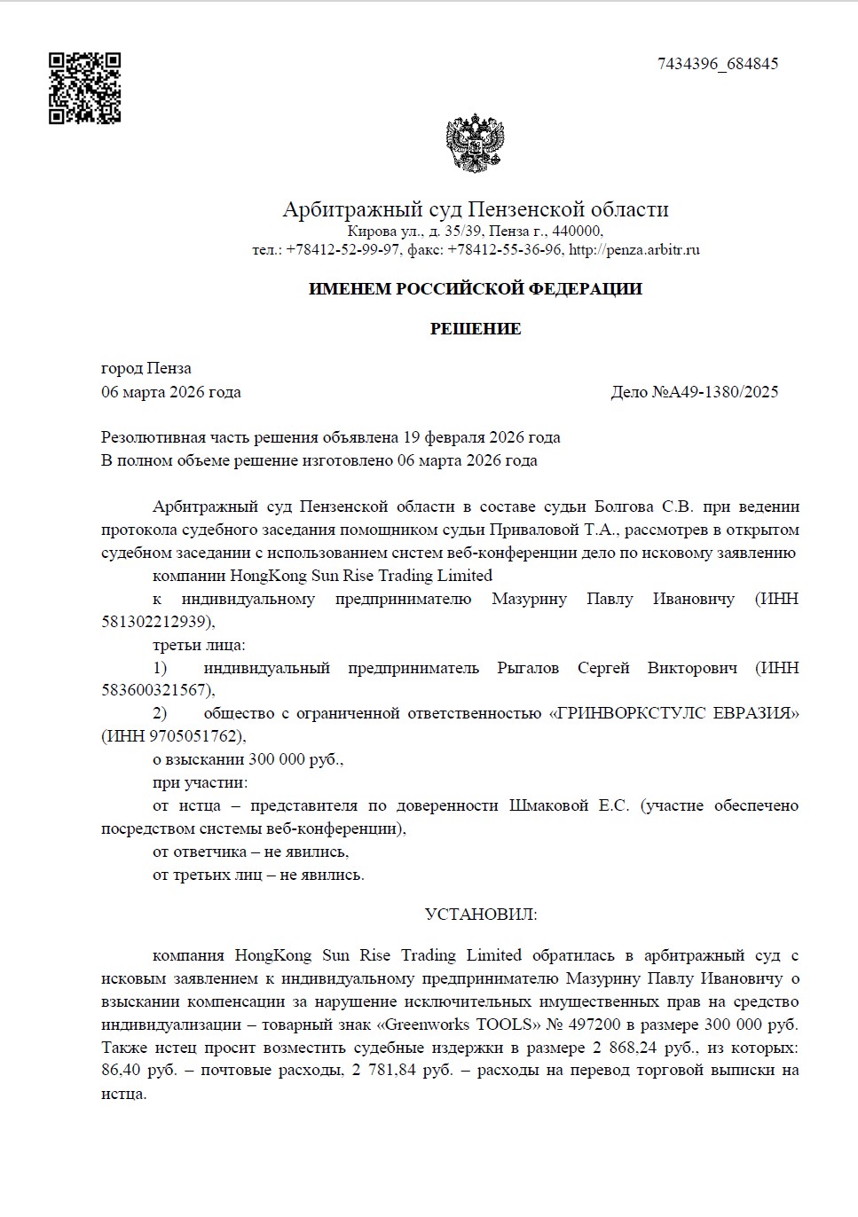 Правообладатель товарного знака «Greenworks» требовал компенсацию за продажу инструмента на Wildberries. Юристам «Оригинальное решение» удалось доказать, что товар является оригинальным и был введен в оборот с согласия самого правообладателя через цепочку официальных дистрибьюторов. Суд полностью отказал иностранной компании в иске.