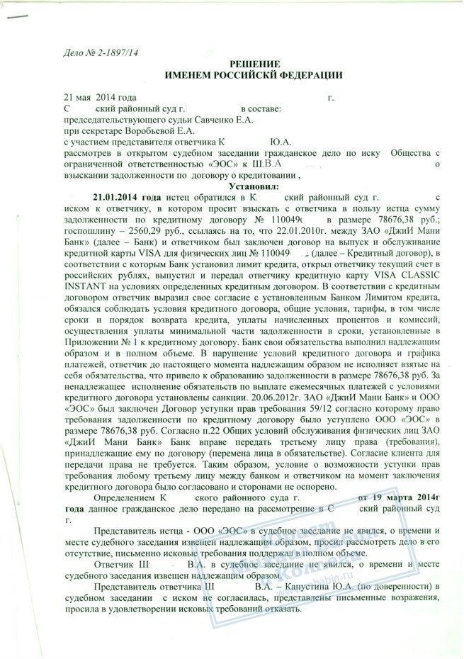 Данные доказательства были озвучены юристом во время судебного заседания и признаны судьей убедительными. В результате ООО «ЭОС» было отказано в праве на взыскание задолженности гражданина Ш.