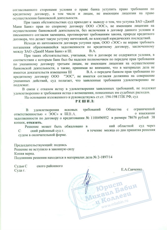ЗАО «ДжиИ Мани Банк» передал права на взыскание непогашенной задолженности гражданина Ш. коллекторскому агентству ООО «ЭОС», которое подало на заемщика в суд.