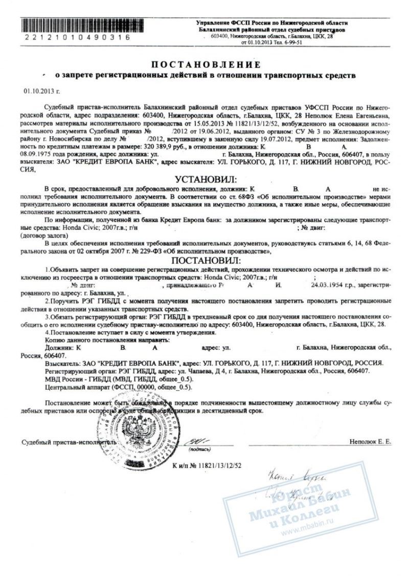 За неуплату кредита судебные приставы грозили арестовать автомобиль должника. Но юрист защитил имущество клиента.