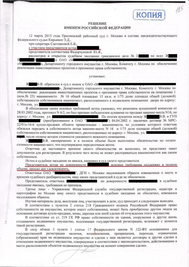 Адвокат ознакомился представленными клиентом материалами и выяснил, что причиной отказов Росреестра в регистрации права явилось недобросовестное действие продавца, который объединил все машиноместа на парковке и поставил их на учет как единый объект в качестве своей собственности. В связи с этим, даже при наличии всех документов, Росреестр отказывал в регистрации права собственности, поскольку машиноместо клиента не было учтено в Государственном кадастре недвижимости в качестве отдельного объекта, а продавец отказывался его выделять. Адвокат Алексей Краснов подготовил исковое заявление и обратился в Пресненский районный суд г. Москвы с требованием о признании за клиентом права собственности.