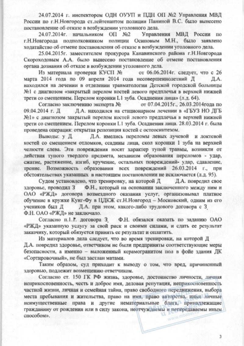 • с тренера в пользу несовершеннолетнего Д. взыскано 72 000 рублей на оплату лечения, 70 000 рублей — компенсация морального вреда, а также расходы на оплату услуг представителя, итого более 150 000 рублей.