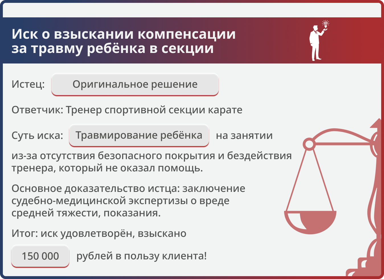 Мы исходили из того, что тренер, проводящий занятия с несовершеннолетними, обязан обеспечить безопасные условия — включая специальное покрытие пола и контроль за состоянием детей. Халатное отношение к этим обязанностям является прямым основанием для гражданско-правовой ответственности. Мы требовали взыскать с тренера (как с непосредственного причинителя вреда) полную стоимость лечения ребёнка, компенсацию морального вреда за физические и нравственные страдания, а также судебные расходы на представителя.