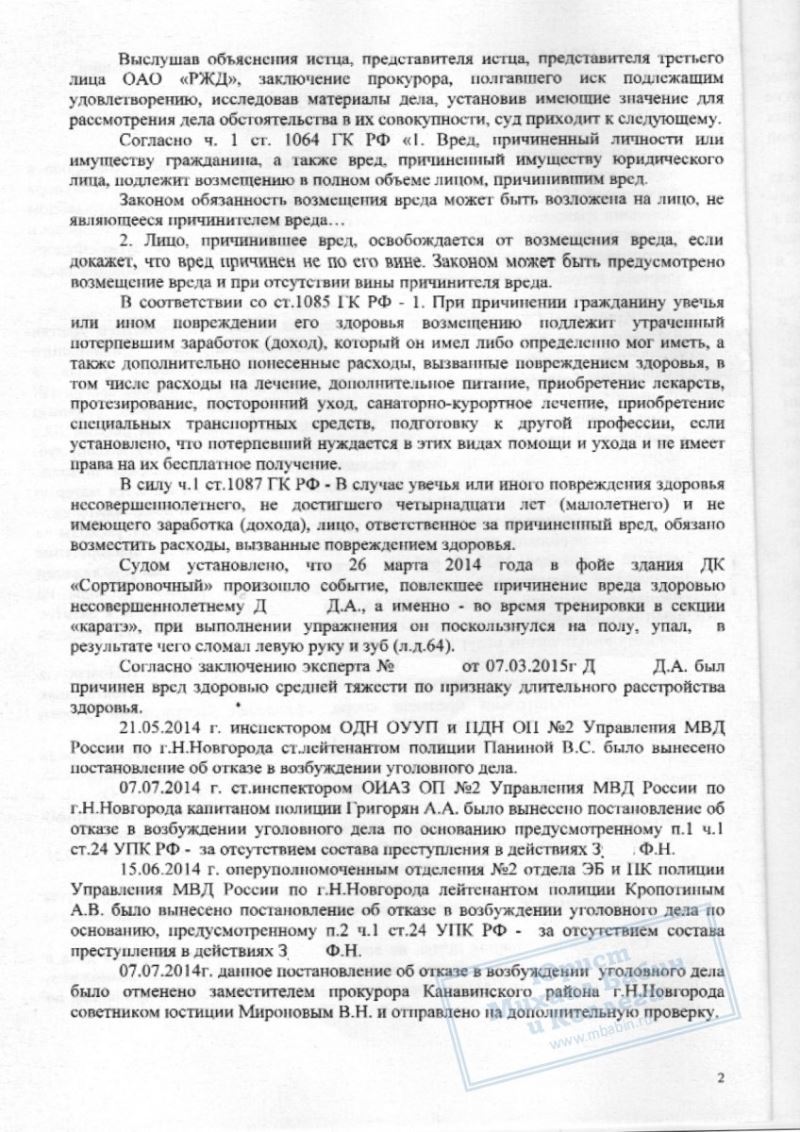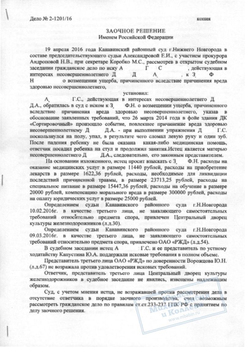 После получения травмы ребёнком его мать обратилась к нам. Мы подали исковое заявление в суд. В ходе разбирательства была назначена и проведена судебно-медицинская экспертиза, которая установила, что здоровью несовершеннолетнего Д. причинён вред средней степени тяжести. В судебных заседаниях мы представили доказательства того, что покрытие на полу в зале не было травмобезопасным, а тренер, заметив состояние мальчика, не остановил занятие, не оказал медицинскую помощь и не вызвал родителей. Суд признал тренера виновным в происшествии.