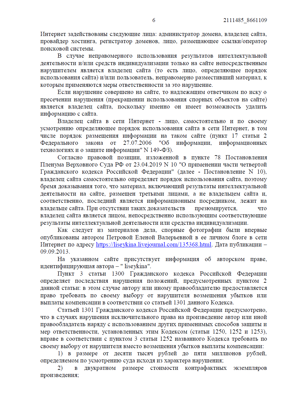Ответчик не знал о неправомерности использования произведения, а после получения претензии принял меры по модерации контента. Также защита указывала, что размещение одного и того же произведения на двух страницах сайта охватывается единством намерений и должно рассматриваться как одно нарушение.