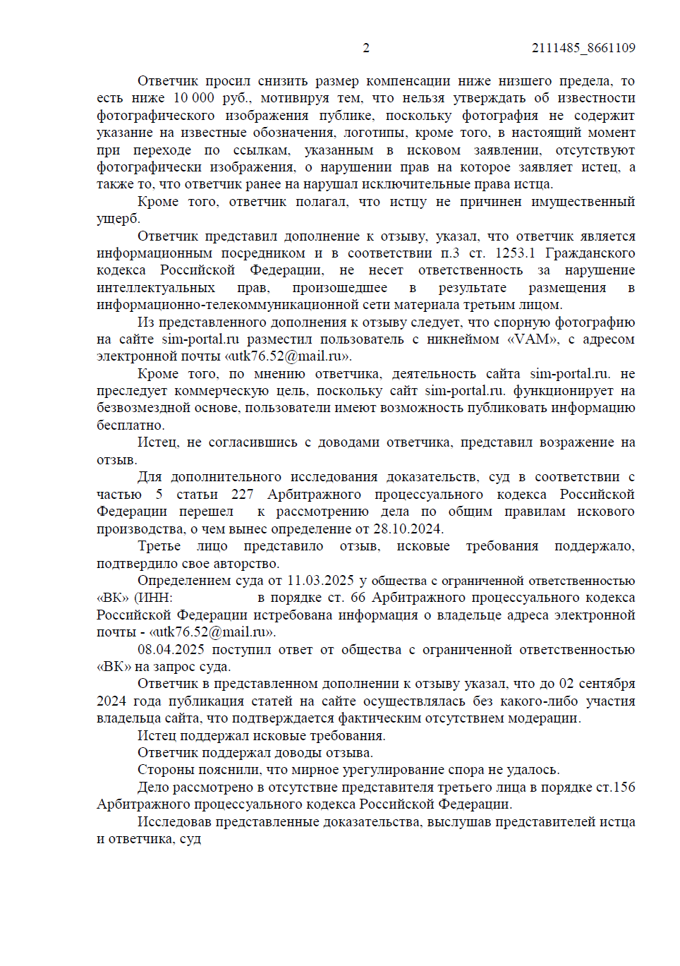 Дело рассматривалось в Арбитражном суде Республики Башкортостан. Защита настаивала на том, что ответчик является информационным посредником, поскольку спорная фотография была размещена пользователем с ником «VAM», а не самим владельцем сайта.