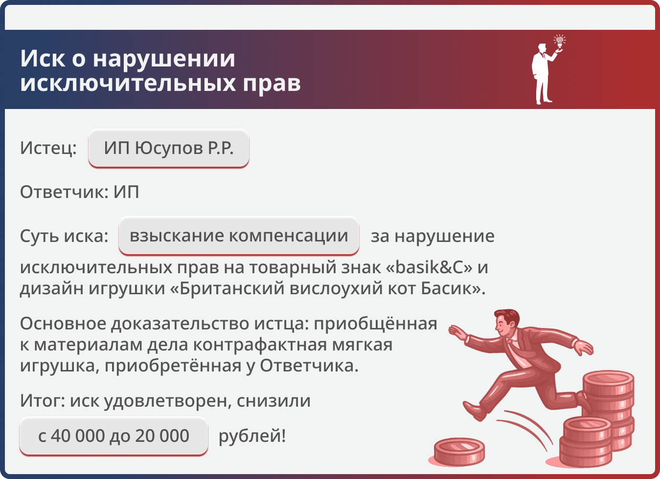 Дело рассматривалось в Арбитражном суде Приморского края в порядке упрощённого производства. Истец требовал взыскания компенсаций за нарушение прав на товарный знак и изображение дизайна «Мягкая игрушка британский вислоухий кот Басик» в размере 40 000 руб., а также возмещения судебных издержек и уплаченной госпошлины.