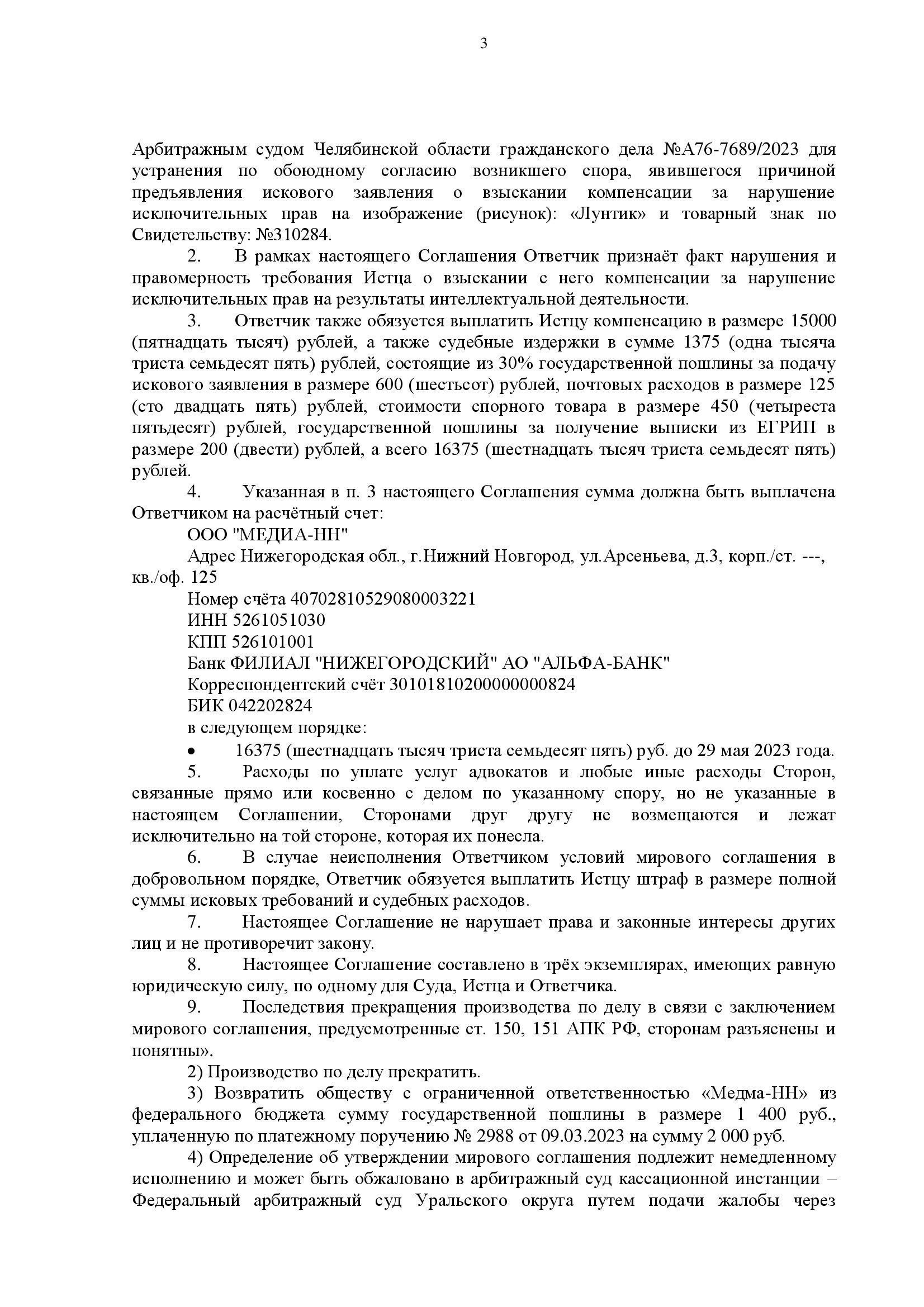 Защита, оценив перспективы спора, инициировала переговоры с истцом о мирном урегулировании. Основной акцент был сделан на готовности ответчика добровольно возместить разумную компенсацию во внесудебном порядке, что позволило бы истцу оперативно получить денежные средства без длительных судебных разбирательств. В результате сторонами было согласовано мировое соглашение на сумму компенсации 15 000 руб.