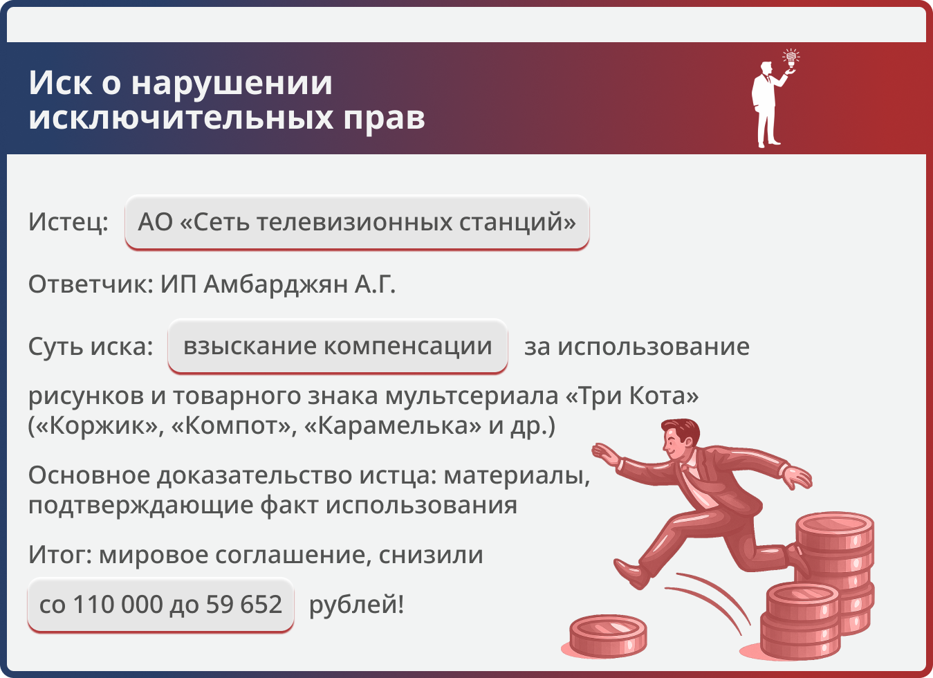 К нашему клиенту, индивидуальному предпринимателю, поступил иск от крупного правообладателя (АО «Сеть телевизионных станций») с требованием взыскать 110 000 рублей компенсации за нарушение авторских прав и товарных знаков, а также дополнительные расходы. Первоначальная сумма претензий была существенной и создавала серьезную финансовую нагрузку.