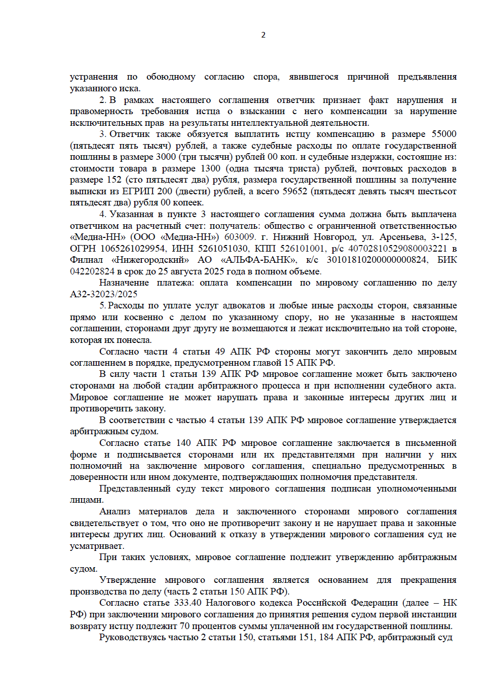 Арбитражный суд утвердил мировое соглашение, полностью прекратив производство по делу. Это юридически завершило конфликт.