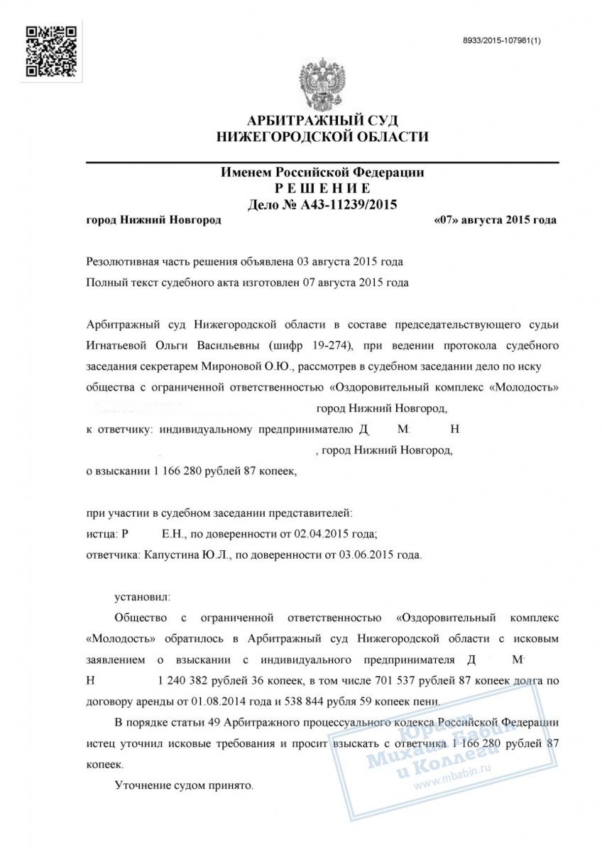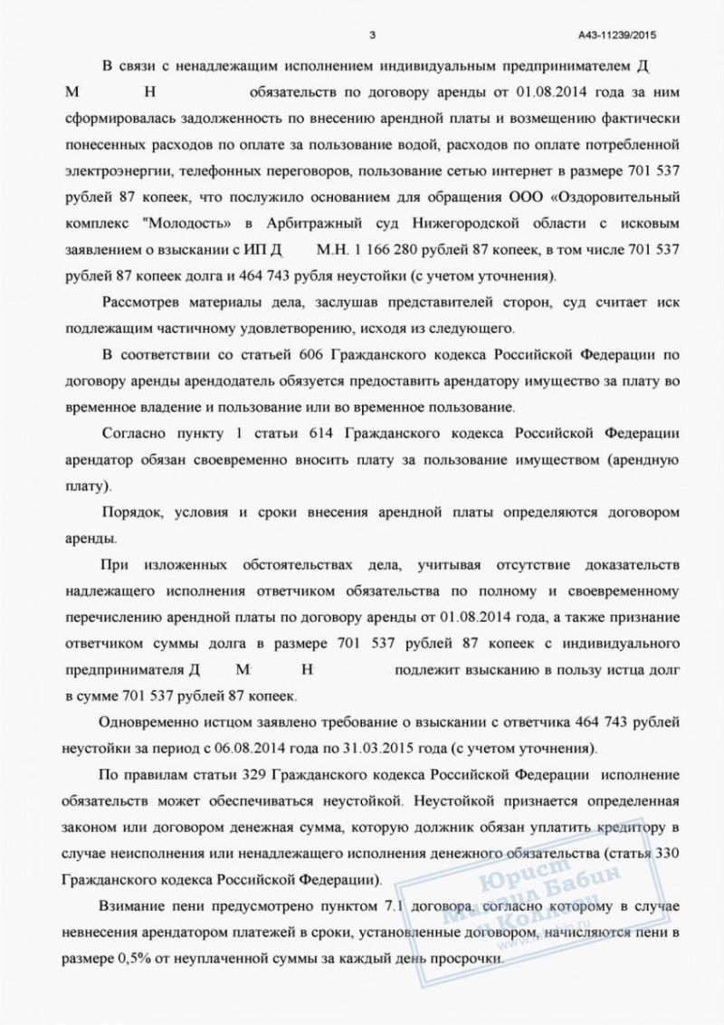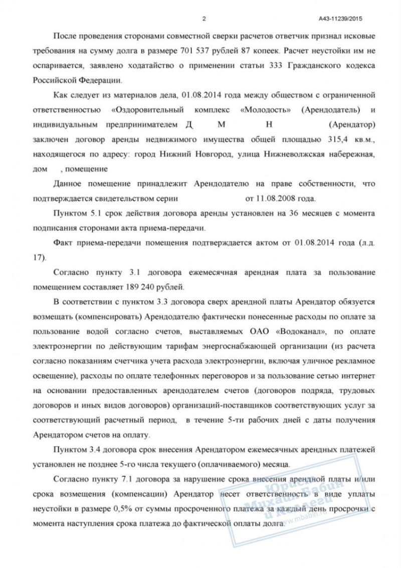 Между индивидуальным предпринимателем Д.М.Н. (наш клиент) и Оздоровительным комплексом «М» был заключён договор аренды помещения площадью 315 кв. метров. Клиент использовал помещение в предпринимательских целях, но в силу объективных причин допустил нарушение сроков внесения арендной платы. Образовалась задолженность в размере около 700 000 рублей.