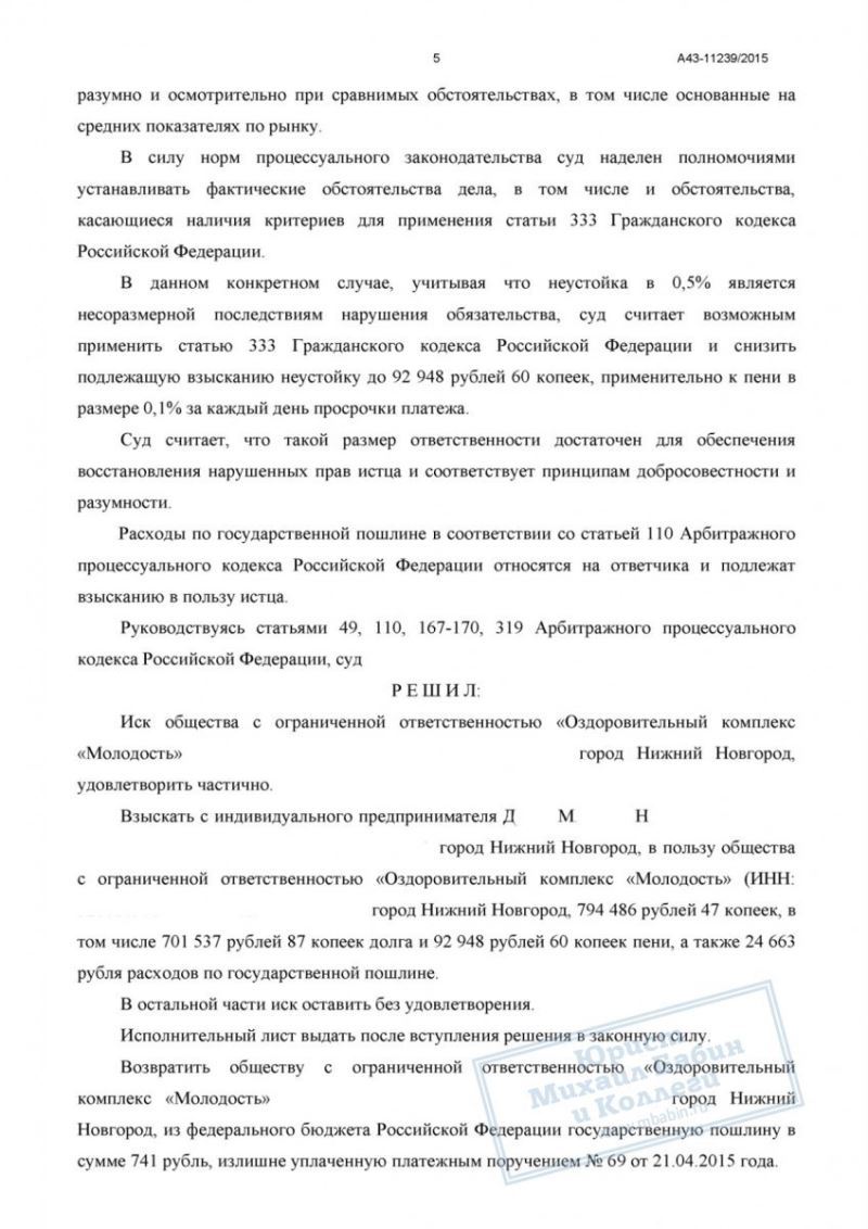 Кроме того, клиент предпринимал меры к погашению задолженности, а нарушение сроков не повлекло для арендодателя серьёзных убытков. Суд согласился с нашими доводами.