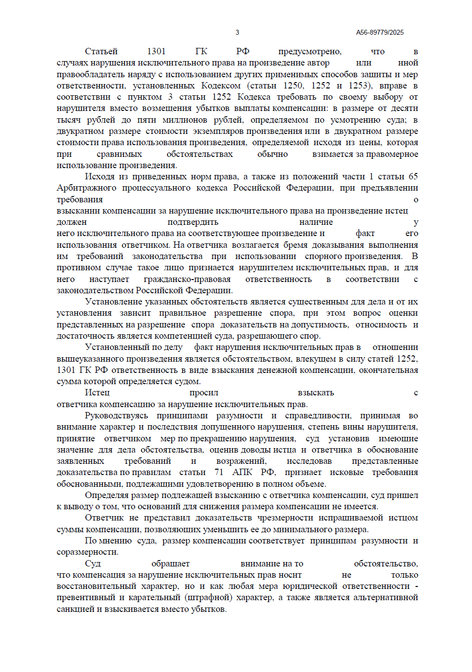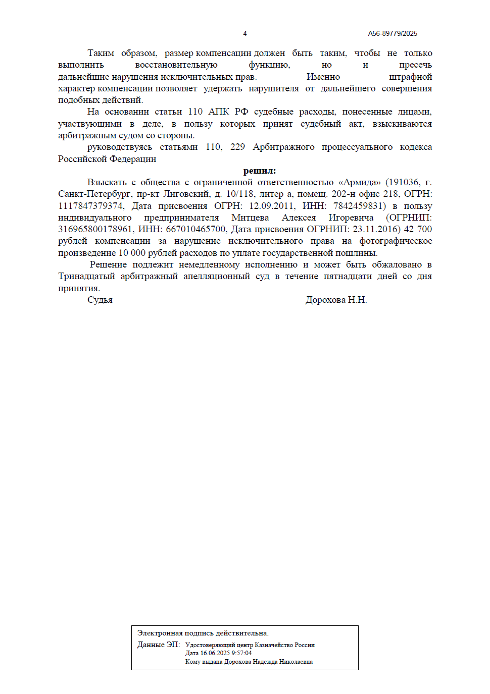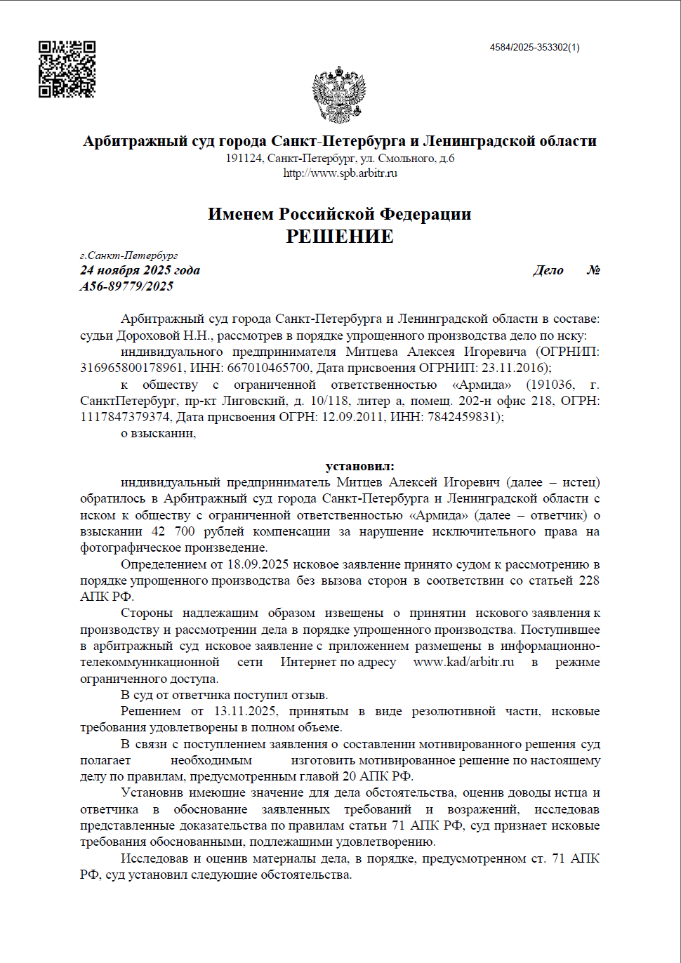 Разбирательство проходило в Арбитражном суде города Санкт-Петербурга и Ленинградской области в порядке упрощенного производства. Мы доказали факт нарушения авторских прав на фотографическое произведение и добились полной выплаты компенсации, несмотря на попытки ответчика оспорить сумму.