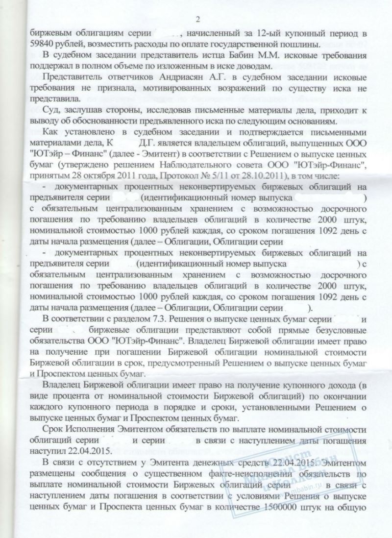 Дело было направлено в суд Ханты-Мансийского округа и оказалось первым выигранным спором против "Авиакомпании ЮТэйр" в Ханты-Мансийске. Суд постановил взыскать сумму номинальной стоимости биржевых облигаций и купонный доход солидарно с обеих организаций в пользу нашего клиента.